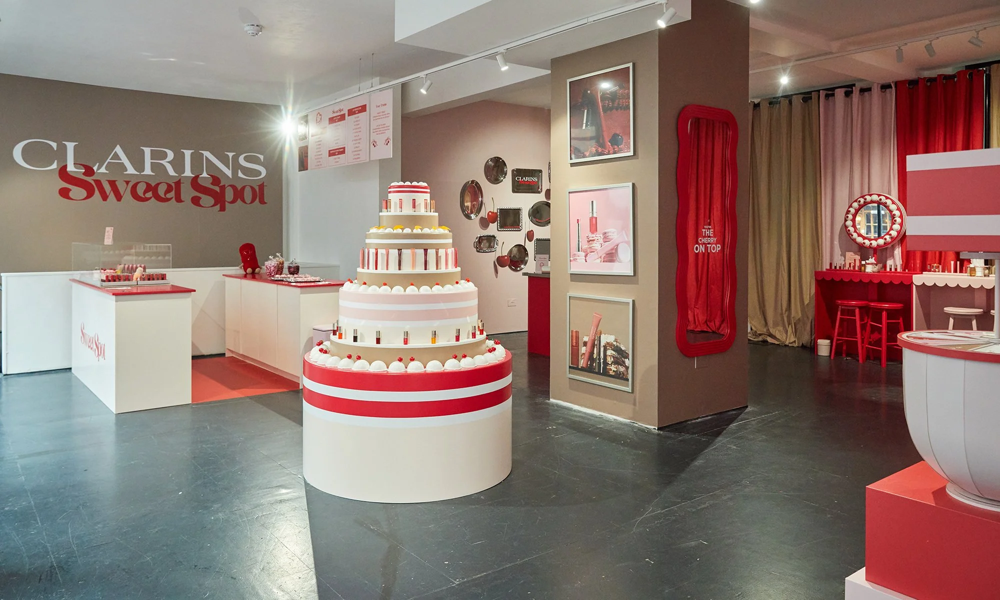 The red, pink, and beige colour scheme drew inspiration from the key lip product flavours - Cherry, Raspberry, and Apricot - while finishing touches such as hanging cherry hooks, a sprayed wavy mirror with vinyl decal, graphic frames, neon lighting, a bakery menu, and a tray wall photo feature with slogan decals brought the concept to life. Together, these elements created a true “wow” factor for visitors.
