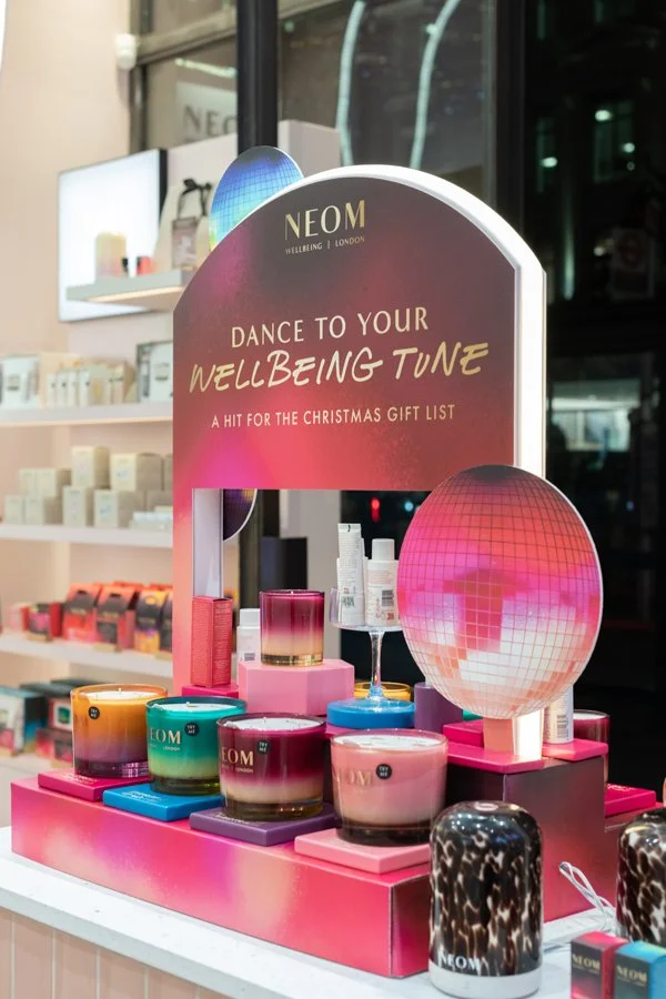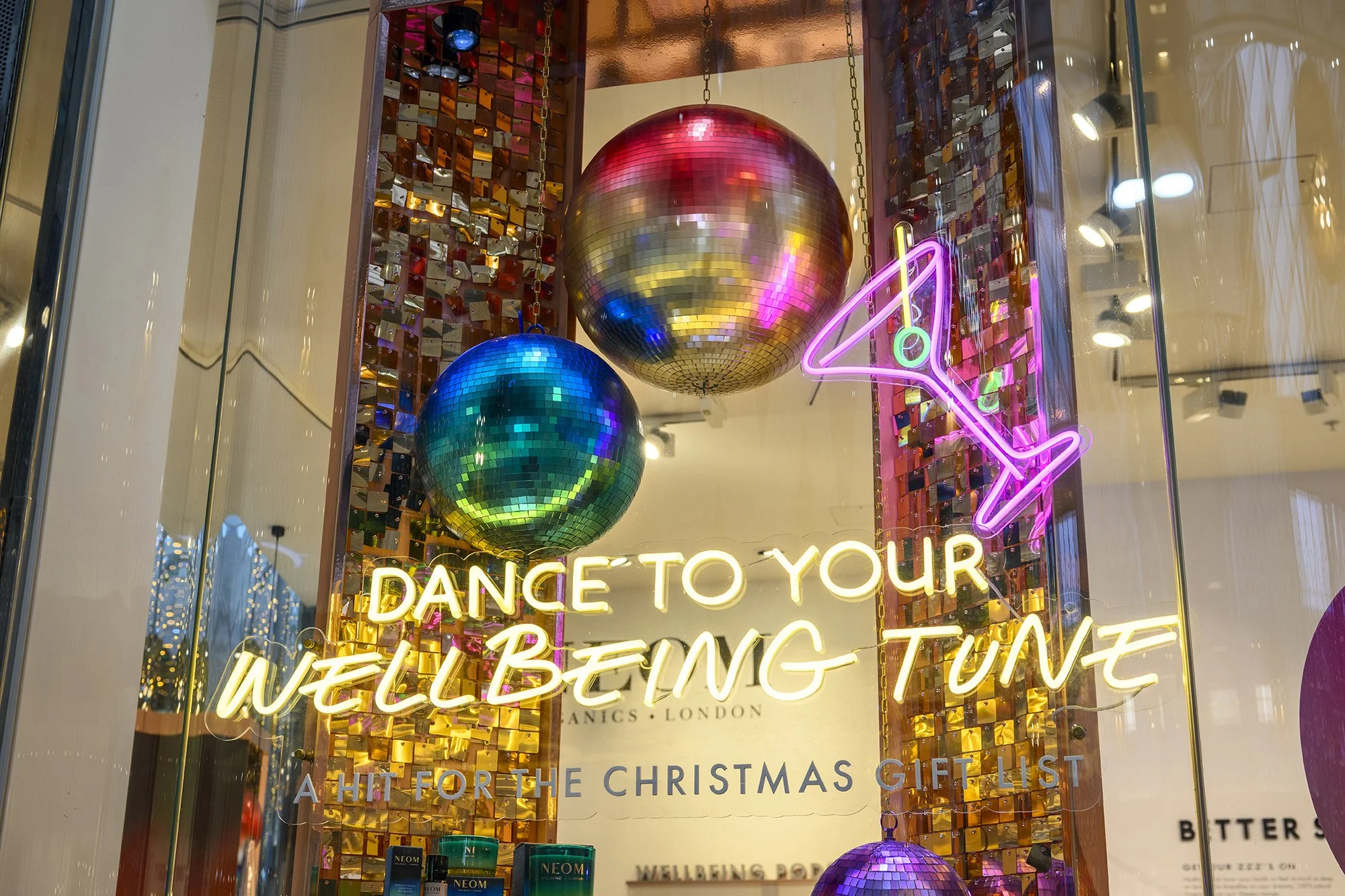 Because Creative worked with the NEOM team to design, produce and install fun yet sophisticated disco-inspired displays in line with their seasonal tagline: “Dance to Your Wellbeing Tune”.